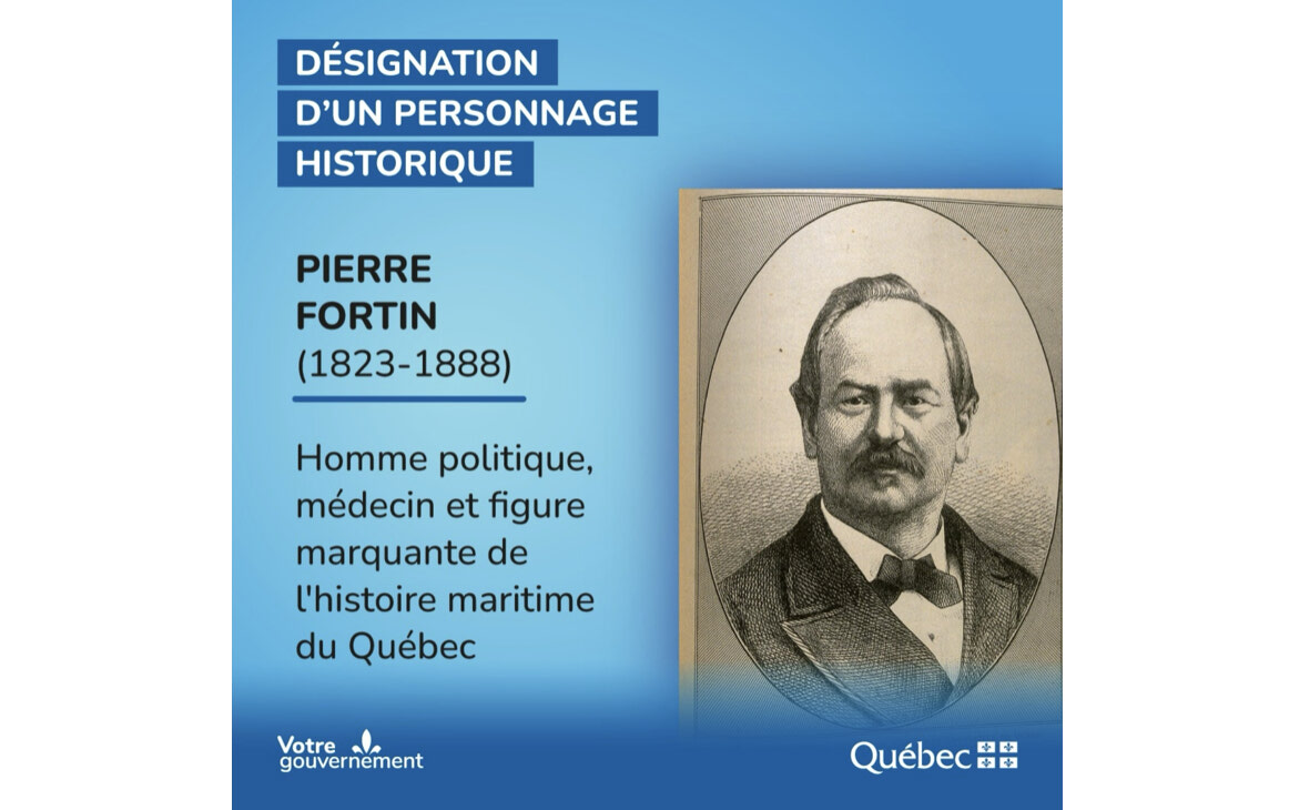 Member of the National Assembly for Gaspé Stéphane Lacroix, on behalf of the Minister of Culture and Communications and Minister responsible for the Outaouais region Mathieu Lacombe, announced at a press conference at the National Assembly of Quebec on November 4 the designation of Pierre Fortin as a historical figure, thus adding him to Quebec's cultural heritage.