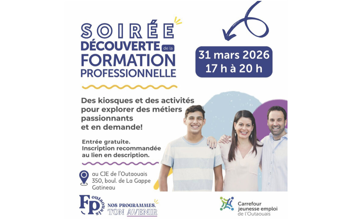 Le Carrefour jeunesse emploi de l’Outaouais (CJEO) est ravi d’accueillir la « quatrième Soirée découverte de la formation professionnelle (FP) Outaouais ». Cet événement, entièrement gratuit, est l’occasion idéale de permettre aux jeunes et aux adultes d’explorer une panoplie de programmes de formation offerts dans la région.