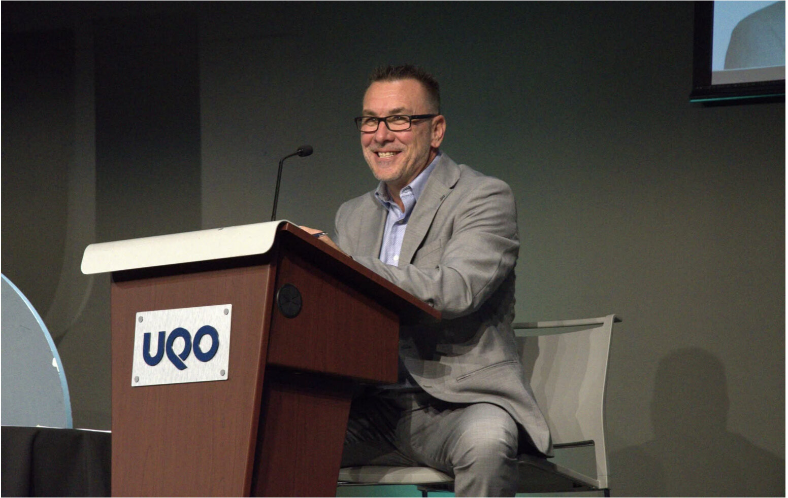 Mario Aubé, chef d’Équipe Mario Aubé et candidat à la mairie de Gatineau, lors d’un débat à l’Université du Québec en Outaouais (UQO) (8 octobre 2025). Photo : Gracieuseté d’Équipe Mario Aubé