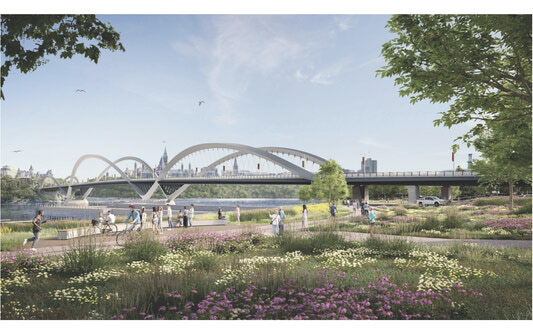 Inspiré par la nature, le concept sélectionné propose une structure caractérisée par trois arches ondulantes évoquant les eaux de la rivière. Le nouveau pont sera conçu de manière à favoriser le transport actif. Il comprendra deux voies réservées à la circulation automobile (une dans chaque direction) et une voie cyclable bidirectionnelle séparée d’un grand espace piétonnier. On y trouvera également des aires de repos et des points d’observation offrant des vues panoramiques.